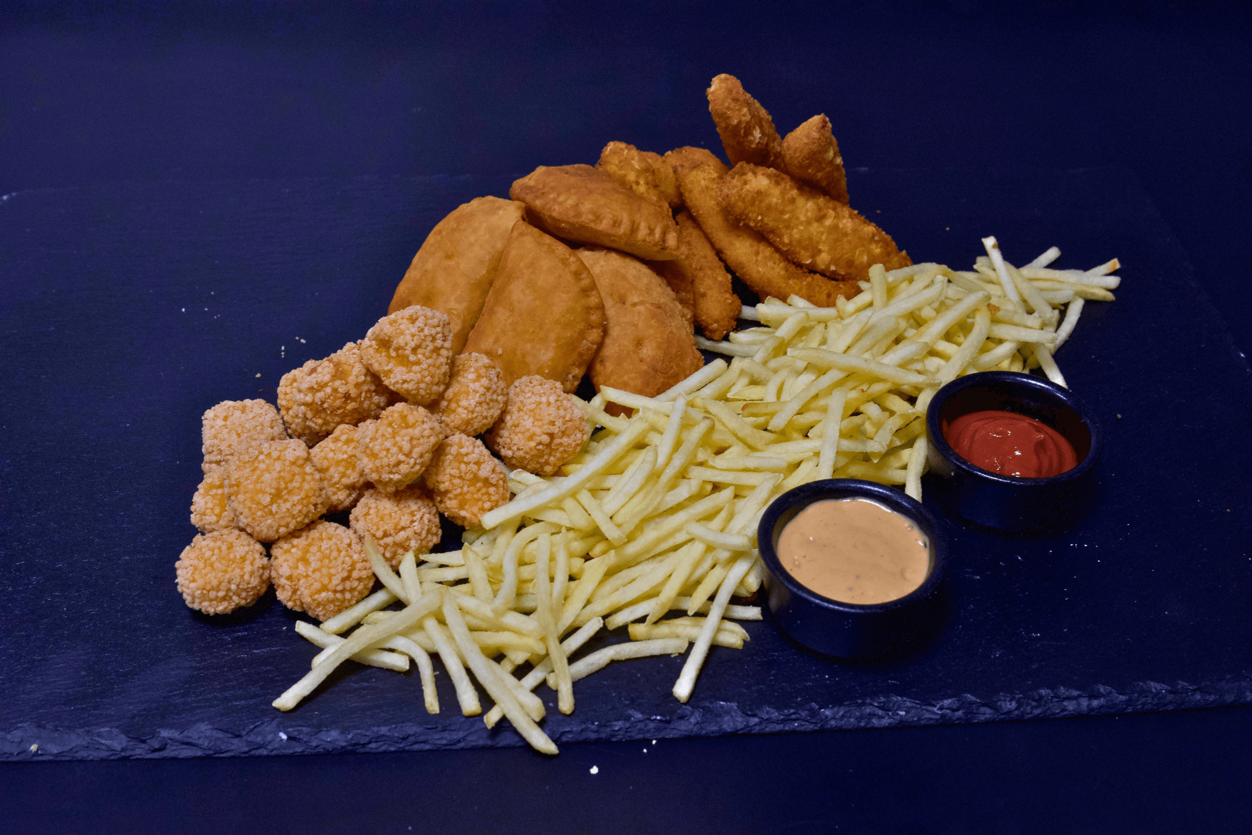 Vištienos rutuliukai, enpanada, vištienos juostelės, bulvytės, pomidorų padažas ir chipotles padažas.